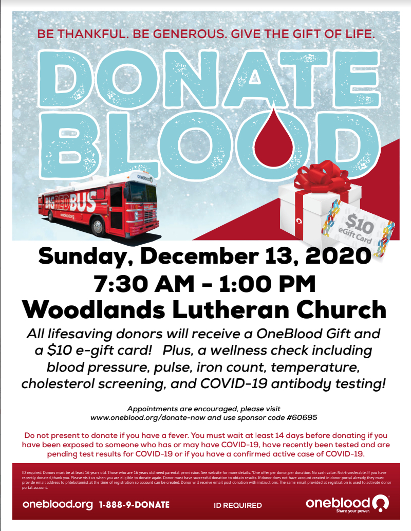 Blood Drive – Dec 13th @ Woodlands Lutheran Church