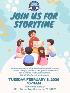 Starting February 3rd, the library will have Story Time for toddlers 2 - 4 years old. Starts at 10:00 am and ends at 11:00 am. If you need additional information please contact the library at 407 469-3838!